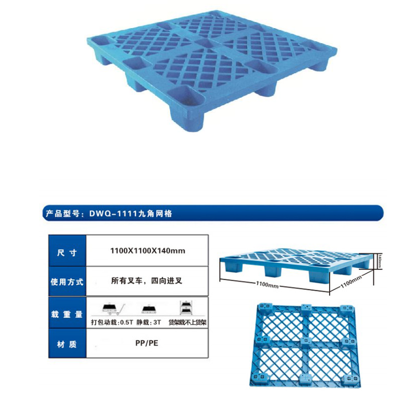 1、九腳塑料托盤能配合機械叉車和手動液壓搬運叉車使用,完成對貨物的搬運、周轉、堆碼。有機械叉車和手動液壓搬運叉車通用的四面叉口,產品可在無條件使用機械叉車的場地和環境中使用。